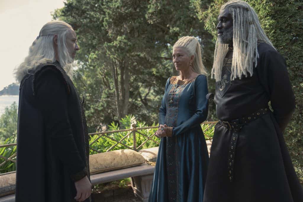 Not only does he now have to worry about the crab feeder, but now his council seems to be in peril. Corlys Valeryon (played by Steve Toussaint) urges the king to take action against this new enemy which could potentially start a war that no one is ready for. Corlys would much rather demonstrate his rule with force rather than diplomacy and it stinks to high heaven – his arrogance almost gets him in hot water with the king, and ironically, also displays his wavering allegiance. Between the premiere and this week’s episode, we see the council doesn’t always agree on matters at hand, but one thing they’re all in agreement with each other on is the perception of the king’s lineage being in a weakened state with no male heir to the throne. As a solution, Corlys and his wife Princess Rhaenys (dubbed “The Queen That Never Was”) speak with Viserys in private and propose a solution for this weakened state of House Targaryen.