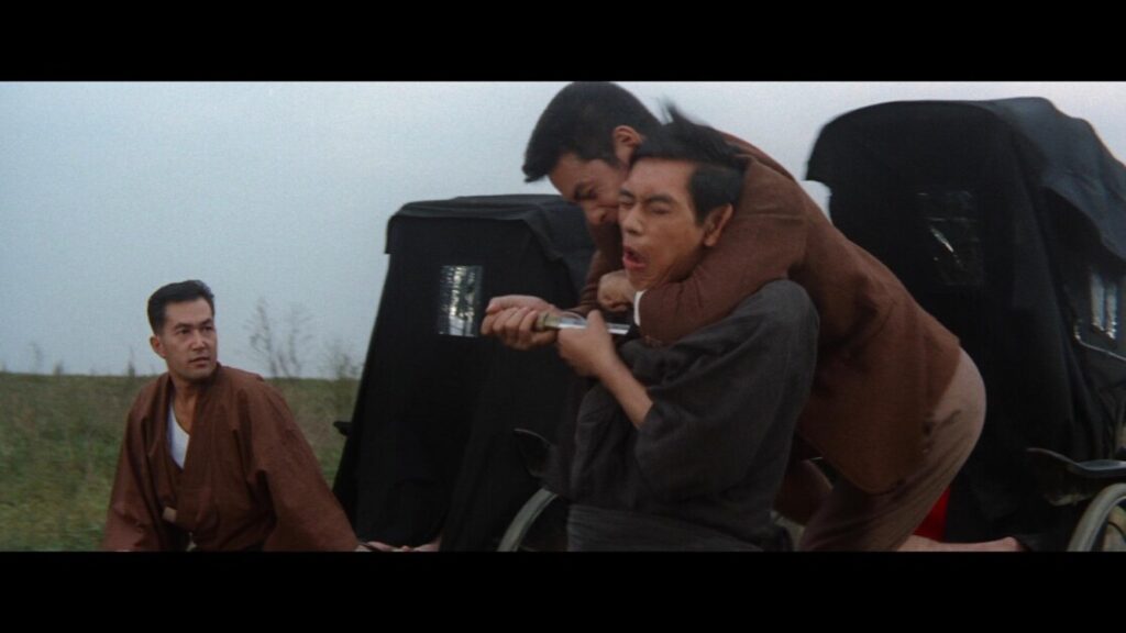 This Blu-Ray comes with an LPCM 2.0 mono track in the original Japanese (with optional English subtitles). It is with great joy that we report that this track is presented with consistent fidelity and only the expected amount of hiss and brittleness in the peaks for a title of this vintage. The film features some kinetic moments near the end that control the chaos in grand fashion. The narrative is quite dialogue-driven and all exchanges come through clearly without getting buried by environmental effects or the score. The score comes through admirably in tandem with the competing noises. This is good work from Radiance Films.